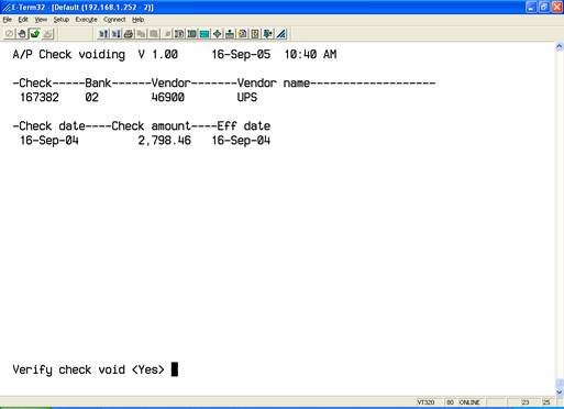Type “V” and press <enter> to void the check. The Void option should be used if the check
