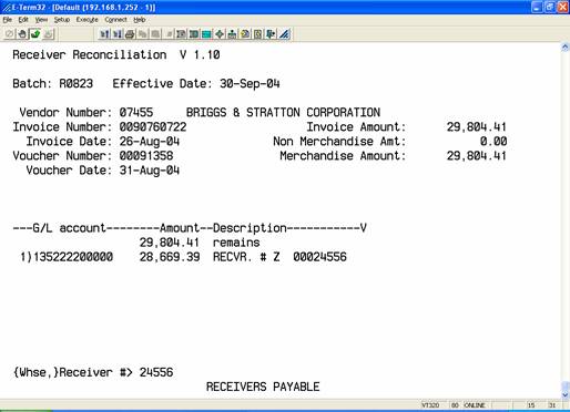 The default GL account number displayed should be for receivers payable. The default GL account number is stored in the vendor record. If it is press <enter>, otherwise type in the GL account number for Receivers Payable and press <enter>. You can also type a ? and press <enter> to display a popup box of GL account numbers then select from the popup box.